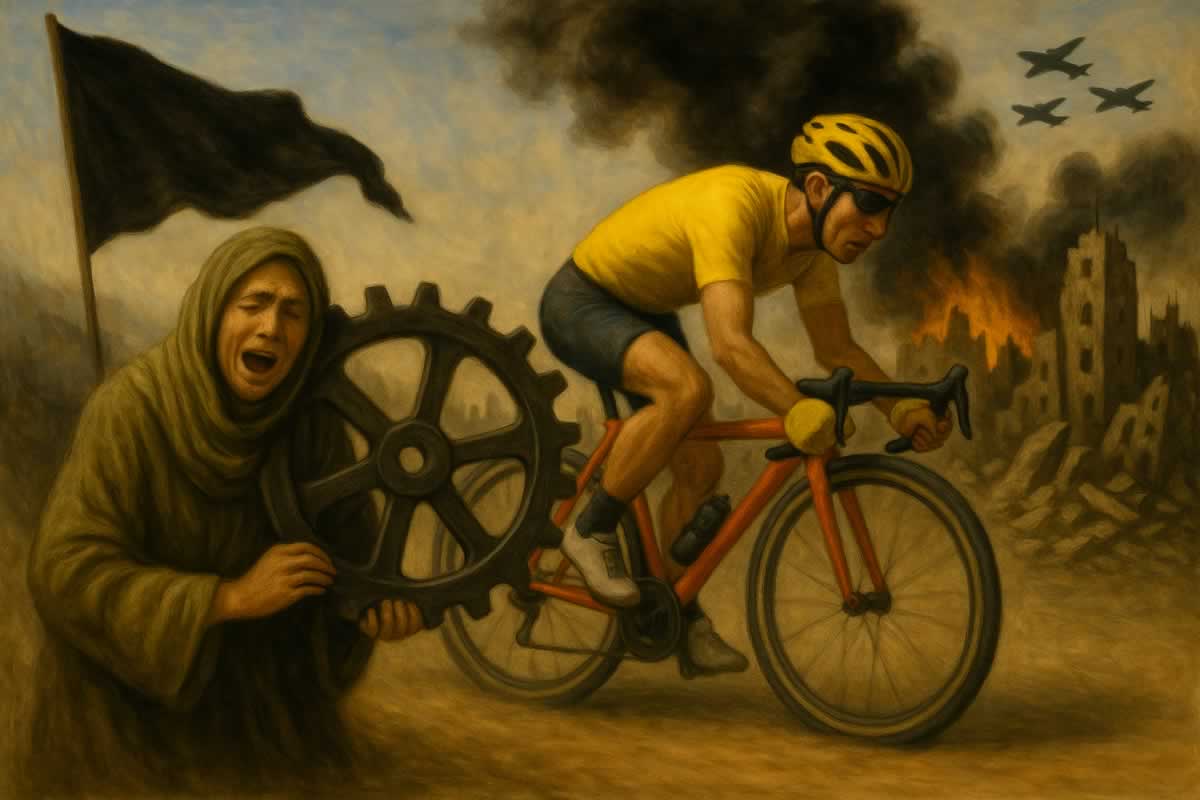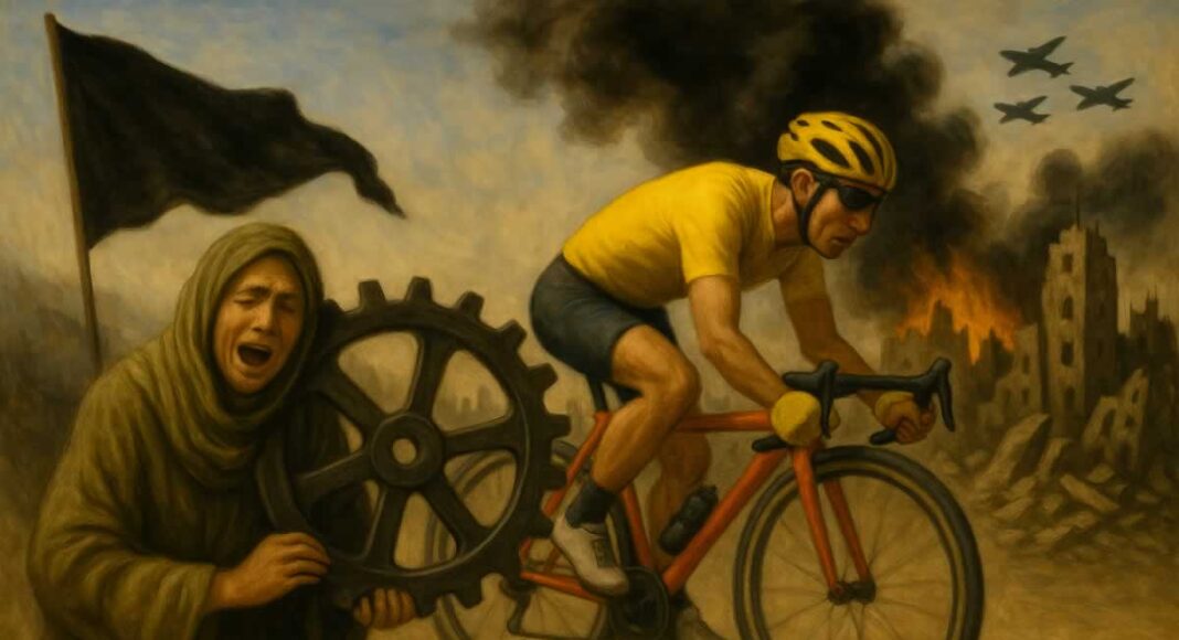 Los periódicos han explicado, que un grupo de activistas se lanzó contra los ciclistas israelíes y que parte del público aplaudió la acción. Eso basta para que los opinadores se rasgasen las vestiduras: cómo se atreven a interrumpir la fiesta, cómo mancillan el “espíritu del deporte”. Lo que a nadie parece preocuparle es que en Gaza no haya fiesta ni deporte, sino cadáveres, ruinas y hambre. Para muchos, lo intolerable no es el genocidio, sino que se haya puesto en cuestión la normalidad en una competición televisada.
