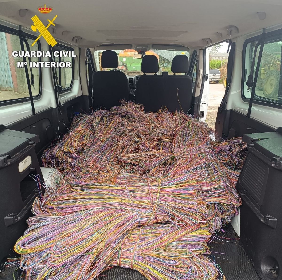En el transcurso de ese operativo los guardias civiles actuantes, ante la sospecha de que habían perpetrado el robo de cable, procedieron a interceptar la furgoneta utilizada por el grupo, hallando en su interior gran cantidad de cable de cobre ya pelado, oculto bajo mantas y plásticos.