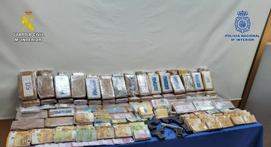 Los agentes intervinieron dos armas de fuego de nueve milímetros con número de serie borrado, un arma de fogueo, cuatro balizas, 17.000 euros en efectivo, una plantación de 100 plantas de marihuana, cinco vehículos de gama alta, una motocicleta y diversos dispositivos móviles.