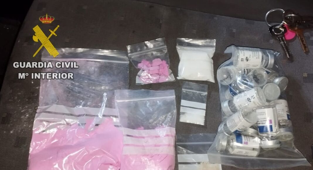 Los guardias civiles que participaban en el dispositivo, tras identificar a su único ocupante y observar cierto nerviosismo en él, procedieron al registro del vehículo y de sus enseres personales, localizando en un compartimento oculto de la guantera del turismo 93 gramos de lo que se conoce como cocaína rosa, 25 gramos de ketamina en polvo, 15 frascos inyectables también de ketamina, 21 unidades de MDMA (éxtasis) y 2 gramos de metanfetamina (cristal).