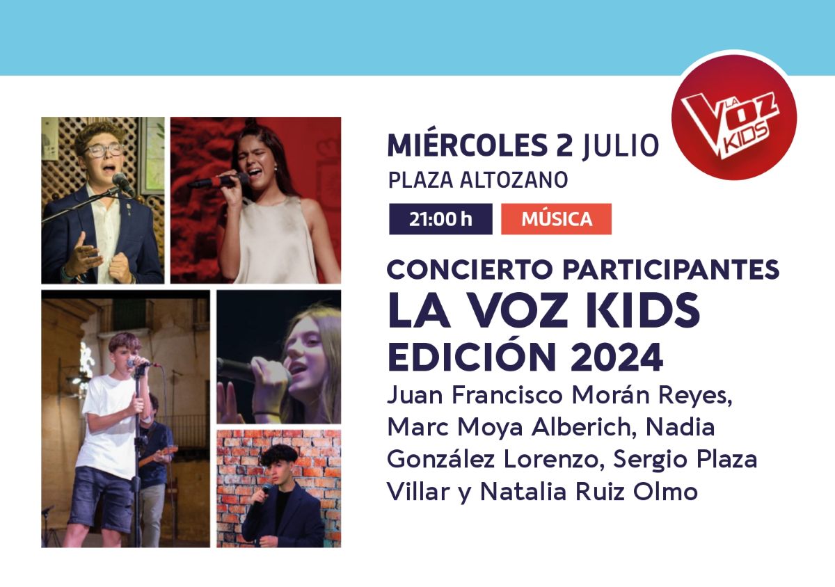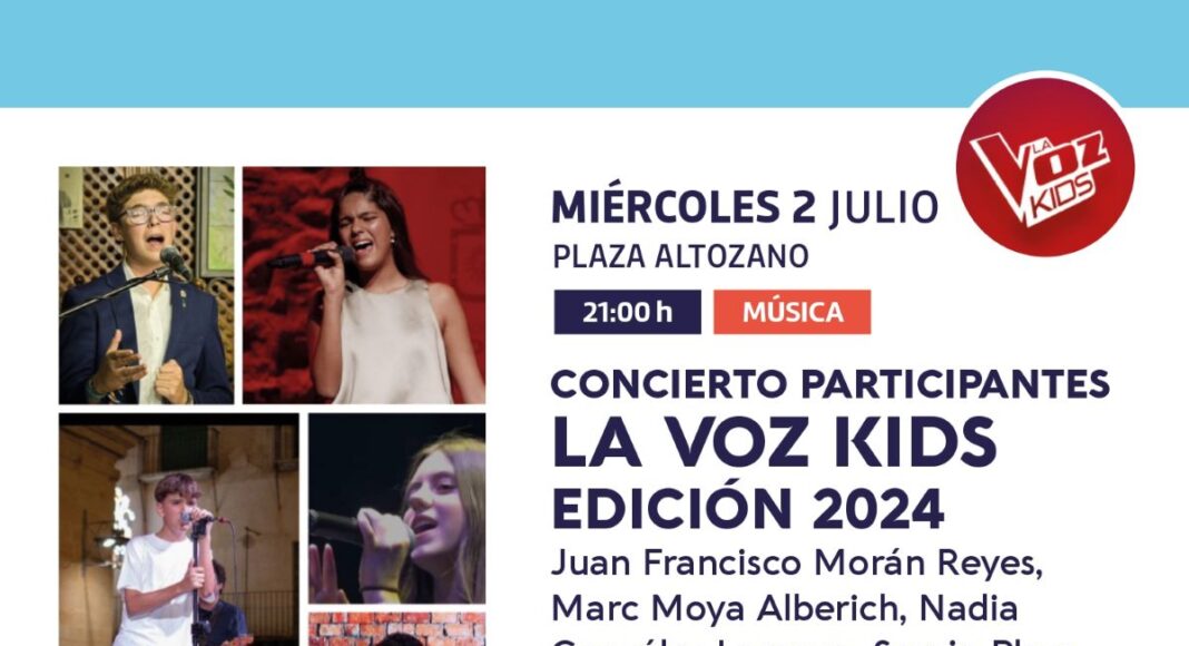 La Plaza del Altozano acogerá hoy miércoles 2 de julio a las 21:00 horas un concierto muy especial protagonizado por varios participantes de la edición 2024 del exitoso programa de televisión “La Voz Kids”. El evento, el cual cuenta con acceso libre, forma parte de la programación del Verano Cultural de la ciudad y reunirá a algunos de los jóvenes cantantes más prometedores del panorama actual.