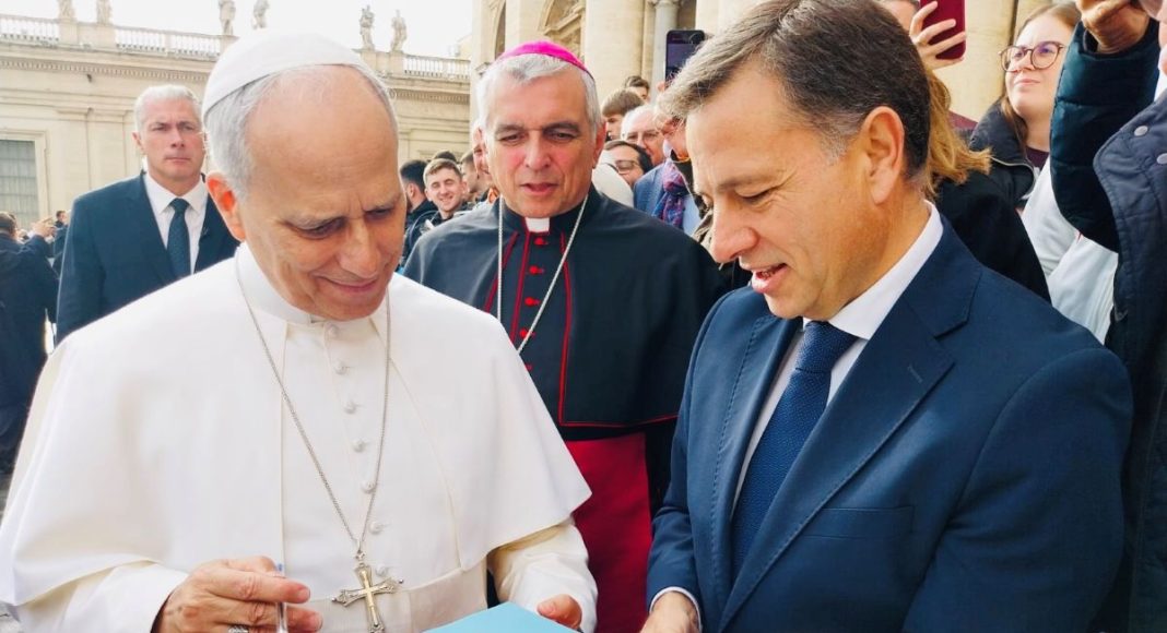 El alcalde de Albacete, Manuel Serrano, y el obispo de la Diócesis, Ángel Román, han entregado al papa León XIV una imagen de la Virgen de Los Llanos y una navaja artesana de la ciudad, durante la audiencia general de este miércoles a la que han acudido un grupo de presos de la cárcel albaceteña de ‘La Torrecica’.