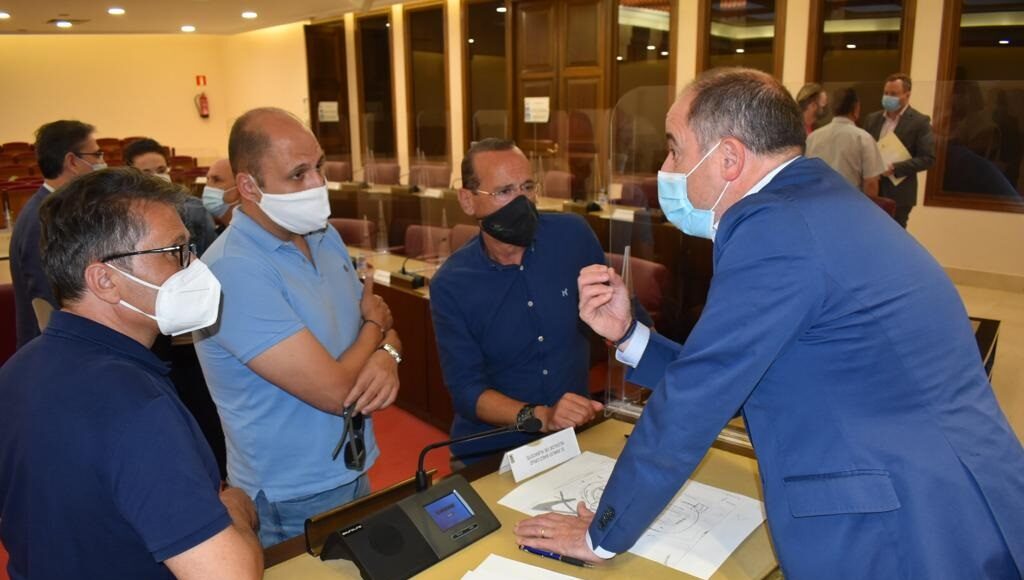 El alcalde de Albacete, Emilio Sáez, ha reunido este jueves en el salón de plenos del Ayuntamiento con representantes de todos los grupos políticos y de los sectores de la hostelería, artesanía, comercio, feriantes, cuchilleros y de los agentes sociales (FEDA, CCOO y UGT) para escuchar sus propuestas de cara a la celebración o no de Feria en septiembre. Emilio Sáez, acompañado del vicealcalde y concejal de Feria, Vicente Casañ, ha señalado que a pesar de que Salud Pública prevé que para septiembre el 70 por ciento de la población estará inmunizada frente a la COVID-19, «hay que ser prudentes, y aunque necesitamos oxígeno y ser felices, en todo caso, lo que se celebre debe hacerse bajo los principios de cautela y prudencia».
