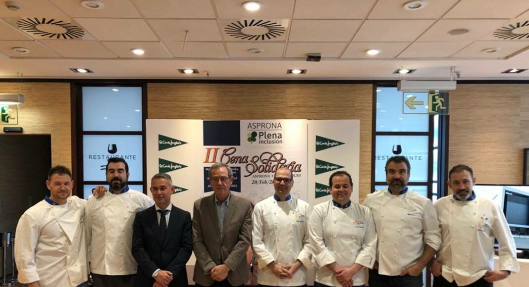 La rueda de prensa se ha celebrado en el Corte Inglés y han asistido el presidente de ASPRONA, Lucio Gómez, el delegado provincial de Euro-Toques, Quique Cerro, el gerente restaurante Posada Real, César Ortega y el director de comunicación del Corte Inglés de Albacete, Víctor Hernández, además de una representación de cocineros de Euro-Toques de Albacete.
