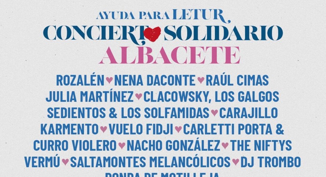 Todos ellos actuarán de forma desinteresada, al igual que los colaboradores que se han querido sumar, aportando su grano de arena, a la reconstrucción de Letur, caso de Arenas Audio, El Mico, Montajes y Producciones Escénicas Luna, El Aguila, Eurotoques, Asociación Provincial de Empresarios de Hostelería y Turismo de Albacete, MG Instalaciones Eléctricas, Cartel, Ticketvip, Ayuntamiento de Albacete, AQO Producciones y Territorio Musical.