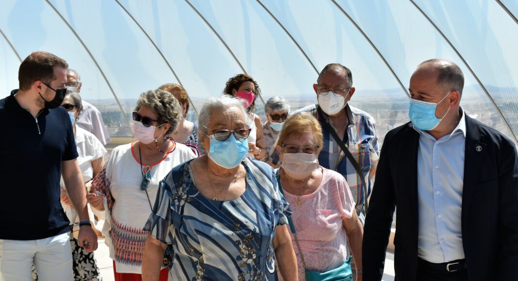 El alcalde, Emilio Sáez, durante la visita que ha cursado junto a un grupo de personas mayores, usuarias del servicio de promoción de la autonomía del Ayuntamiento de Albacete, al mirador de los Depósitos de la Fiesta del Árbol, se ha referido a la importancia de poner en práctica este tipo de colaboraciones y acompañamientos “a nuestros mayores, que han conseguido poner en pie esta ciudad, y con quienes tenemos la deferencia de ofrecerles una visita especial a las tan ansiadas vistas de la ciudad desde este mirador”.
