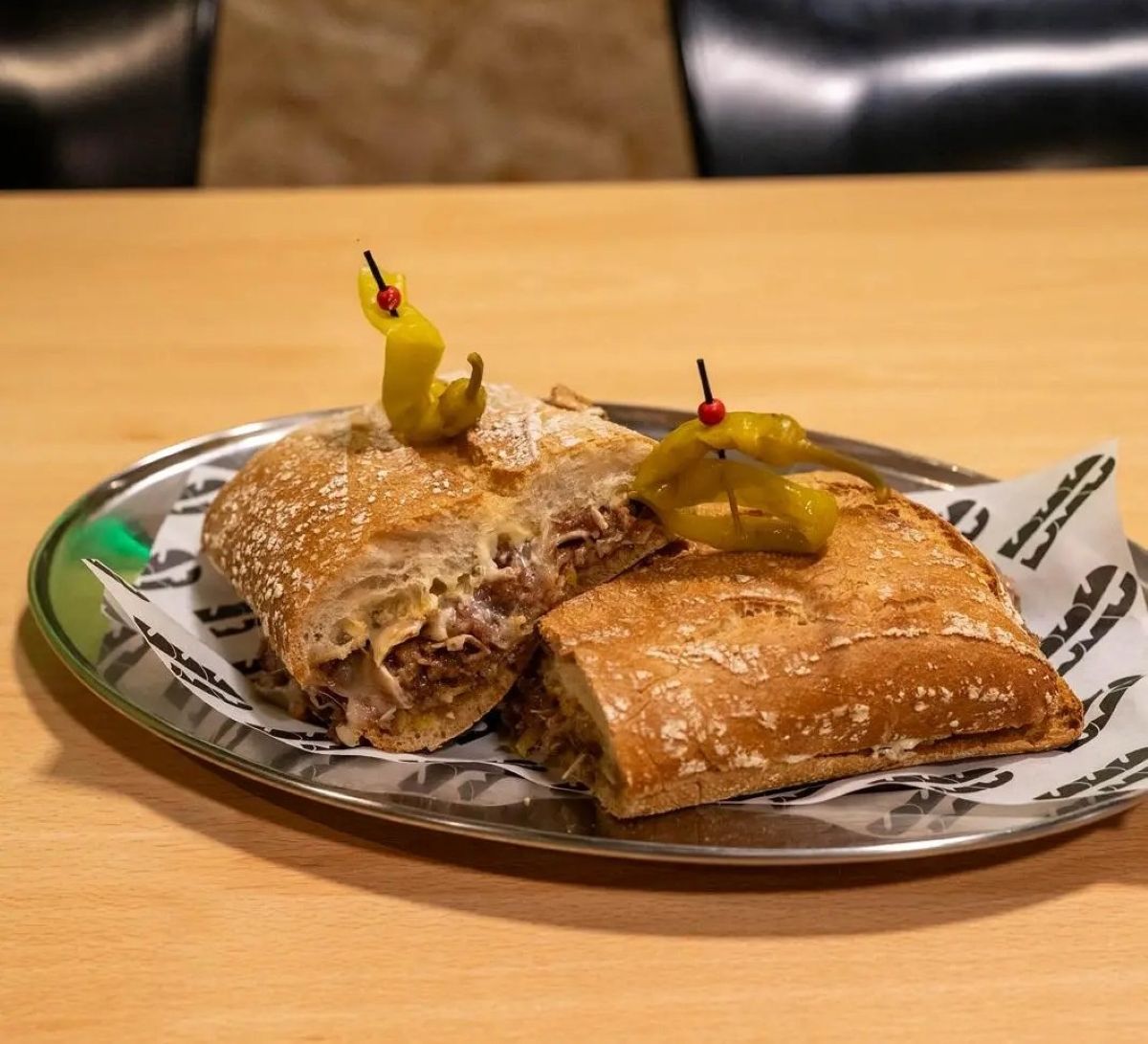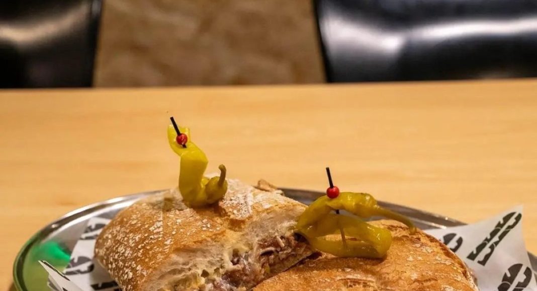 El bocadillo no pasa desapercibido. Se elabora con pan tipo chapata tostado con mantequilla avellanada y lleva como base piparra dulce picada. A esto se suma una lámina de oreja de cerdo adobada, cocinada a baja temperatura y rematada a la plancha, acompañada de queso provolone fundido y mayonesa de ajo asado. Como toque final, el pan se corona con una piparra entera en la parte superior.