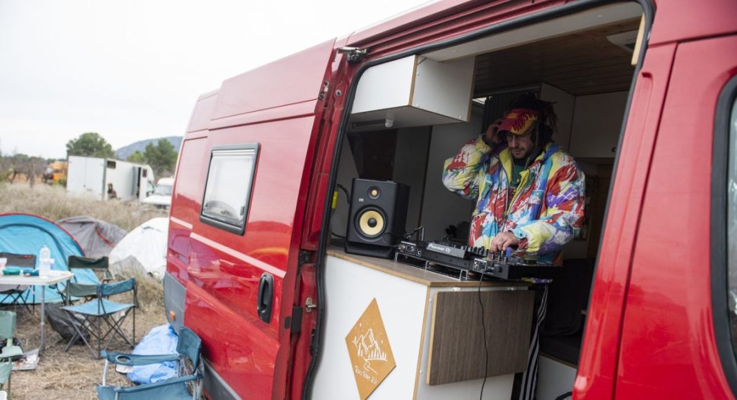 «Hemos estado 11 horas de cola para acceder. Las uvas nos las tuvimos que comer en el camino», detalla el ravero mientras enseña su mesa de mezclas acoplada a su vehículo.