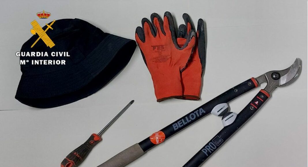 En el momento de la detención, y tras el registro del vehículo, la Guardia Civil localizó en su interior una cizalla de grandes dimensiones y unos guantes utilizados por el autor para la comisión del hecho delictivo.