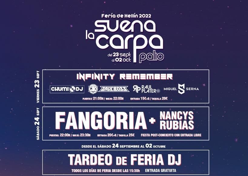 Fangoria, Las Nacys Rubias, SFDK, M-Clan, Daviles de Novelda, D’azabache y una fiesta ‘remember’ con DJs de renombre como Chumi DJ, Javi Boss, Raul Platero y Miguel Serna completan la apuesta que hace la promotora de conciertos Berrintxe Producciones junto con el Ayuntamiento de Hellín para la feria hellinera de este año.