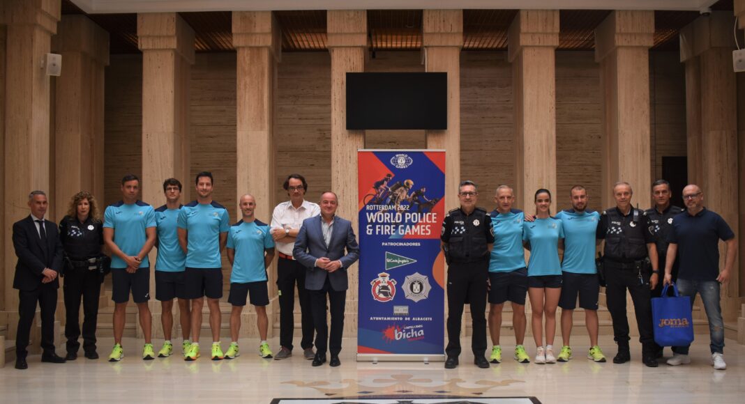 El alcalde de Albacete, Emilio Sáez, ha recibido a una representación de los integrantes de la Policía Local y del Servicio Contra Incendios de Albacete (SCIAB) que participarán en los ‘World Police and Fire Games’, que tendrán lugar en Rotterdam (Holanda) entre los días 22 y 31 de julio de 2022. En total, serán 13 policías y 4 bomberos los que representarán a la ciudad en la cita en disciplinas como biatlón, triatlón, natación, lucha, remo o atletismo.