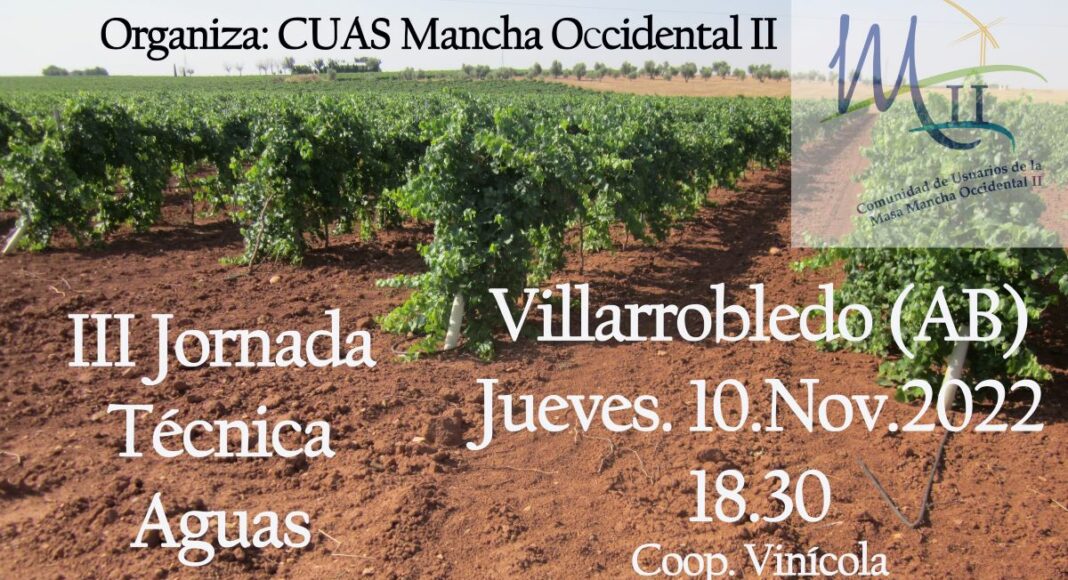 La Comunidad de Usuarios de Aguas Subterráneas (CUAS) de la Masa Mancha Occidental II celebrará su ‘III Jornada Técnica de Aguas Subterráneas y Regadío’ el jueves 10 de noviembre, a las 18:30 horas, en la Cooperativa Vinícola de Villarrobledo, en la localidad albaceteña.