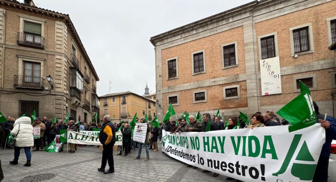 Cientos de agricultores y ganaderos de toda la Comunidad Autónoma se han concentrado este martes ante la sede de la Delegación del Gobierno de Castilla-La Mancha, en Toledo, convocados por Asaja, para mostrar su rechazo a la política que está llevando el Gobierno central así como al acuerdo con el Mercosur y afirmar que se está poniendo en juego la «soberanía» alimentaria del país.