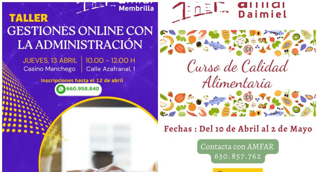 Por último, AMFAR ha organizado un taller sobre “Gestiones online con la Administración” en la localidad de Membrilla (Ciudad Real). Esta actividad tendrá lugar el jueves, 13 de abril, de 10 a 12 de la mañana en el Casino Manchego (Calle Azafranal, 1).