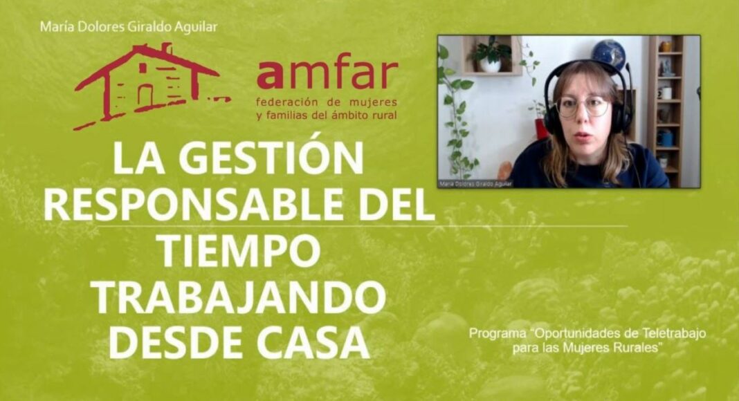 La Federación de Mujeres y Familias del Ámbito Rural (AMFAR) ha impartido hoy la segunda sesión del programa “Oportunidades del Teletrabajo para las Mujeres Rurales” a través de un webinar gratuito en el que se ha abordado “La gestión responsable del tiempo trabajando desde casa”.
