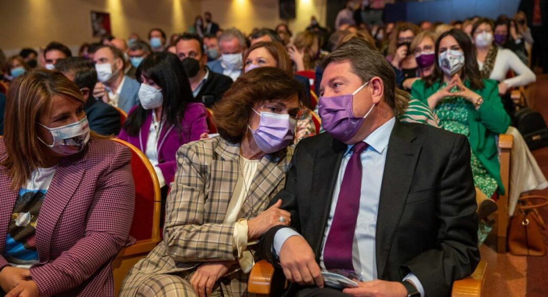 Este acto, amenizado en las pausas por la cantante María Sánchez y que se celebra a 24 horas del Día Internacional de la Mujer para no solapar lo institucional con lo reivindicativo de las manifestaciones previstas para este martes, ha servido para reconocer la labor de la exvicepresidenta del Gobierno Carmen Calvo por su trayectoria feminista; a Cooperativas-Agroalimentarias por su apuesta por la integración de la mujer al mundo cooperativista de la región; y al Centro de la Mujer de Manzanares, distinguido por una exposición pionera que ha girado por otros centros de la Comunidad Autónoma.