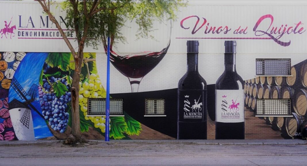 No es el único despliegue artístico que atesora el edificio ‘Vinos del Quijote’. El joven muralista alcazareño,Javier López, más conocido en el gremio como Jobs, por sus diseños de gran plasticidad, ha puesto su arte al servicio de los vinos de La Mancha con la decoración de una de las paredes exteriores del centro (200 m2) con una gran belleza visual.