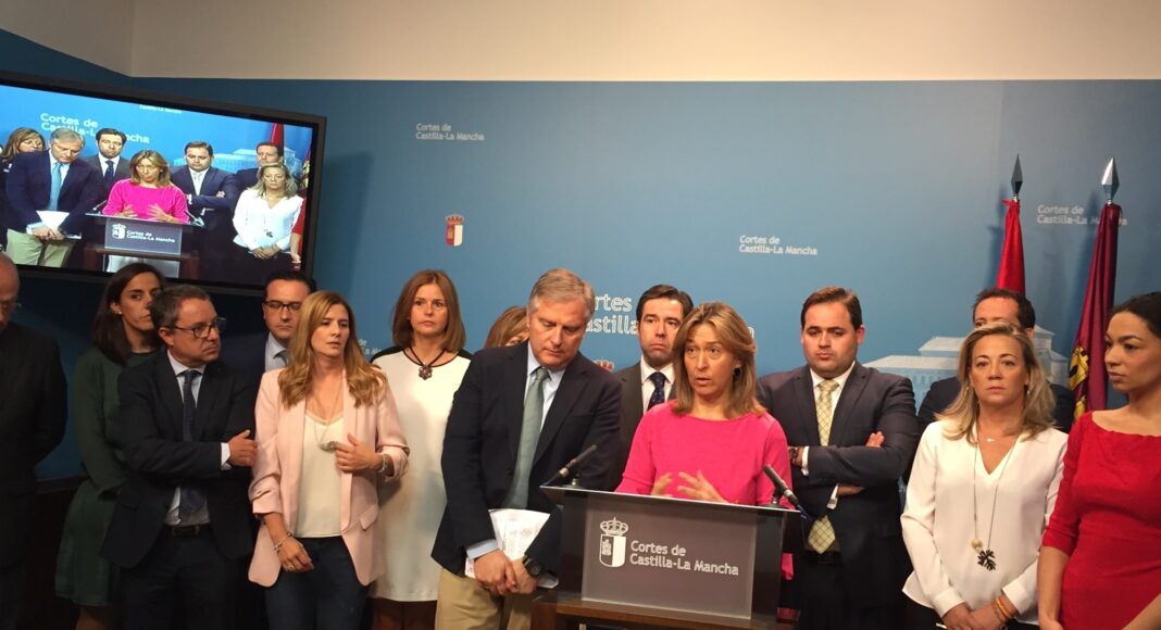 La sesión ha arrancado con una rueda de prensa de la presidenta del Grupo Parlamentario Popular, Ana Guarinos, y del portavoz del mismo, Francisco Cañizares. Si la primera de ellos ha vuelto a pedir la dimisión del vicepresidente segundo del Gobierno regional, José García Molina, el segundo ha anunciado la presentación de una Proposición no de Ley para que las Cortes regionales insten al conjunto de las instituciones españolas a «usar con firmeza y proporcionalidad todos los mecanismos en defensa de la soberanía del pueblo español».