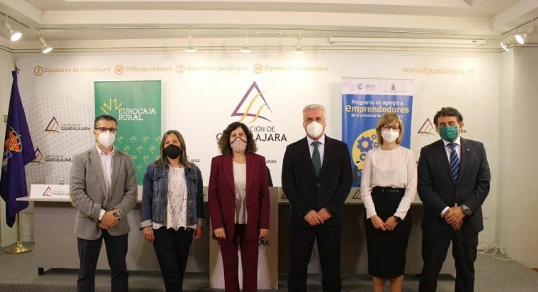 En el acto de presentación de este programa han participado María Soledad García, presidenta de CEOE-CEPYME Guadalajara, acompañada de su secretario general, Javier Arriola, y José Luis Vega, presidente de la Diputación Provincial de Guadalajara, acompañado de la diputada de Promoción Económica, Rosa Abel.