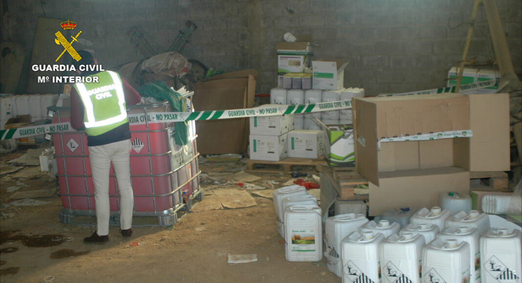 Durante esta investigación se tuvo conocimiento de la existencia de dos naves agrícolas en las que se almacenaban estos productos que no contaban con ningún permiso o autorización, para su posterior venta y distribución a los agricultores de la comarca. En el interior de estas se encontraron almacenados casi 3.940 litros de productos químicos. Además, se comprobó que dichas naves no cumplían con las condiciones exigidas por la normativa que regula el almacenamiento de los productos químicos.
