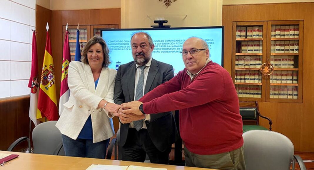 El rector de la Universidad de Castilla-La Mancha (UCLM), Julián Garde; la consejera de Economía, Empresas y Empleo, Patricia Franco, y el presidente de la Federación Regional de Organizaciones Provinciales de Gremios Artesanos de Castilla-La Mancha (FRACAMAN), Roberto Perea, han firmado este viernes en Toledo un acuerdo de colaboración para la puesta en marcha del Máster de Formación Permanente en Artesanía y Diseño Contemporáneo, pionero en su enfoque dentro del sistema universitario español, que comenzará a impartirse en octubre desde la Facultad de Bellas Artes de Cuenca.