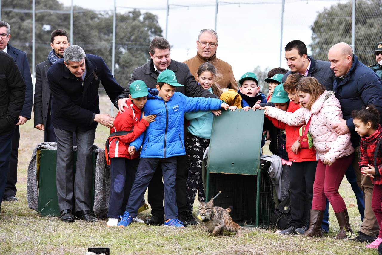 Acompañado por el consejero de Agricultura, Medio Ambiente y Desarrollo Rural, Francisco Martínez Arroyo, y de un centenar de alumnos del Colegio Público ‘Nuestra Señora del Sagrario’ de Mazarambroz, han abierto la puerta para que Planeta y Pupila, macho y hembra de un año de edad, ejemplares procedentes del centro de cría en cautividad de ‘La Olivilla’ en Jaén y del Zoobotánico de Jerez de la Frontera (Cádiz), comiencen su nueva vida en libertad en esta área de reintroducción de Castilla-La Mancha.