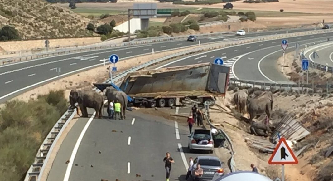 El Partido Animalista (Pacma) estudia acciones legales por «posibles irregularidades» en el transporte de los elefantes accidentados este lunes en la A-30, a la altura de Pozo Cañada, tras la salida de vía de un camión.