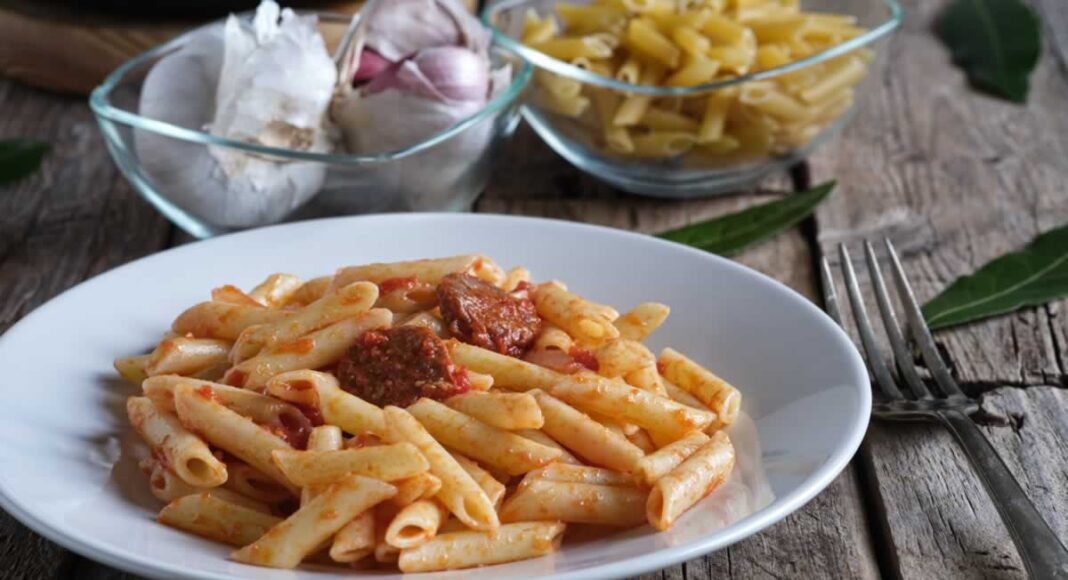 A continuación dejamos cocer todo durante unos 15 minutos a fuego medio, y cuando haya reducido el caldo ya tendremos la salsa. Se agregan entonces los macarrones cocidos y se rehoga todo junto durante tres minutos. Luego se añade un poco de pimienta y albahaca o una pizca de orégano, y a servir acompañado de Provolone o Pecorino rayado.