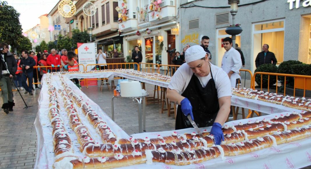 Los artesanos de la Pastelería la Rosa en Alcázar de San Juan han elaborado un roscón de 220 metros de longitud pensado para servir a 2.200 personas, que tiene un fin solidario a beneficio de Cruz Roja.