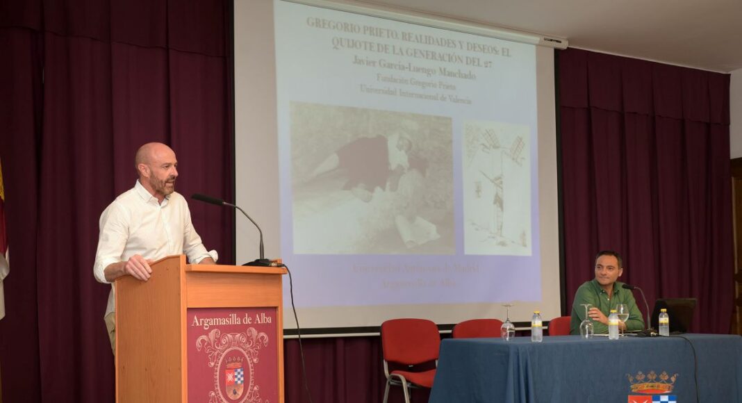El concejal de Cultura, José Antonio Navarro, que fue el encargado de presentar al ponente, destacó la estrecha relación entre Argamasilla de Alba y Gregorio Prieto, como pone de manifiesto que eligiese la Casa de Medrano para firmar el acta del nacimiento de la fundación que lleva su nombre y donase 17 obras de tema quijotesco, que están expuestas en la Galería Gregorio Prieto de la Casa de Medrano.