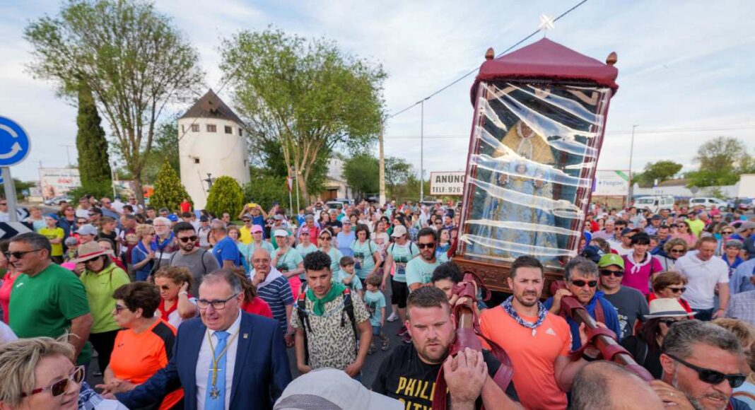 La romería, propiamente dicha, se inició superadas las 16:30 horas cuando las campanas de la ermita anunciaron la salida de la imagen a hombros de diez porteadores hasta el humilladero, donde hizo una parada para despedirse del que ha sido su hogar desde enero y comenzó a caminar los más de 12 kilómetros que la separaban de la que será su casa hasta el mes de septiembre, la iglesia de San Juan Bautista en Argamasilla de Alba.