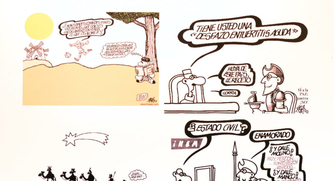 En la muestra puede verse una pequeña selección de las muchas viñetas que en su larga trayectoria realizó el humorista gráfico, escritor, director de cine y televisión, y colaborador radiofónico, Antonio Fraguas de Pablo ‘Forges‘ (1942-2018) basadas en el Quijote y sus personajes, a través de la cual hace una crítica, en muchos casos humorística, de la sociedad, la política o la economía, y siempre desde un claro compromiso con los derechos y libertades de la ciudadanía.