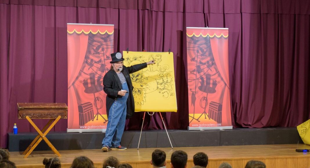 De origen argentino, pero afincado en España desde hace muchos años, Gustavo Otero ha ilustrado numerosos libros de texto, como explica a lo largo del espectáculo, además de un libro de poesía de Joaquín Sabina y algunos de sus sonetos; también muchos libros de literatura infantil, algunos de ellos de Barco de Vapor.
