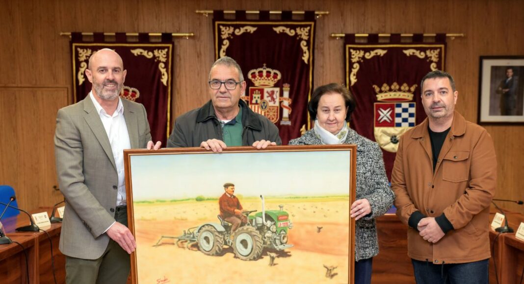La obra donada representa al padre de Sindo arando una viña con un minitractor, vulgarmente denominado “mula mecánica”, una obra muy personal que decidió donar a raíz de la exposición realizada en la Casa de Medrano bajo el título: ‘Yo fui tractorista’; organizada por el área de Cultura durante la pasada Feria y Fiestas 2022, en la cual el artista hizo un recorrido por un periodo de su vida en la que ejerció de tractorista, al tiempo que representaba escenas agrícolas en torno al tractor.