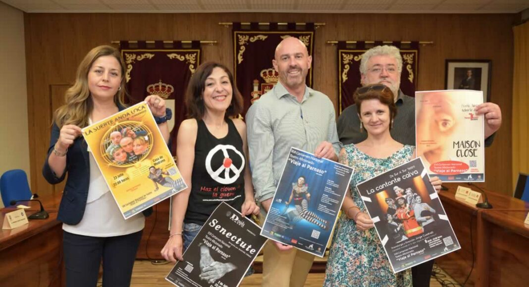 El alcalde, Pedro Ángel Jiménez, junto a la directora de Primer Acto Teatro, María Eugenia Moya; la directora de la oficina de Globalcaja en la localidad, Mercedes López, y la representante de Reale Seguros, Mónica Cantón, han presentado este lunes una nueva edición del Viaje al Parnaso, que el alcalde ha calificado de “primera magnitud”, pues a él se presentan “las más importantes compañías de teatro aficionado del territorio nacional”. Este año la organización ha recibido 127 propuestas, lo que hace muy complejo para el jurado y Primer Acto Teatro seleccionar las obras que se ponen en escena todos los años, un trabajo que reconoció Jiménez.