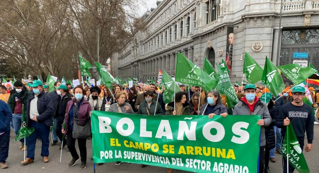 Bajo el lema “El mundo rural despierta”, los bolañegos se unieron a los más de 400.000 manifestantes, según las estimaciones de las organizaciones convocantes, portando una pancarta que rezaba “Bolaños se arruina” y con la que se manifestaban “por la supervivencia del sector agrario”.