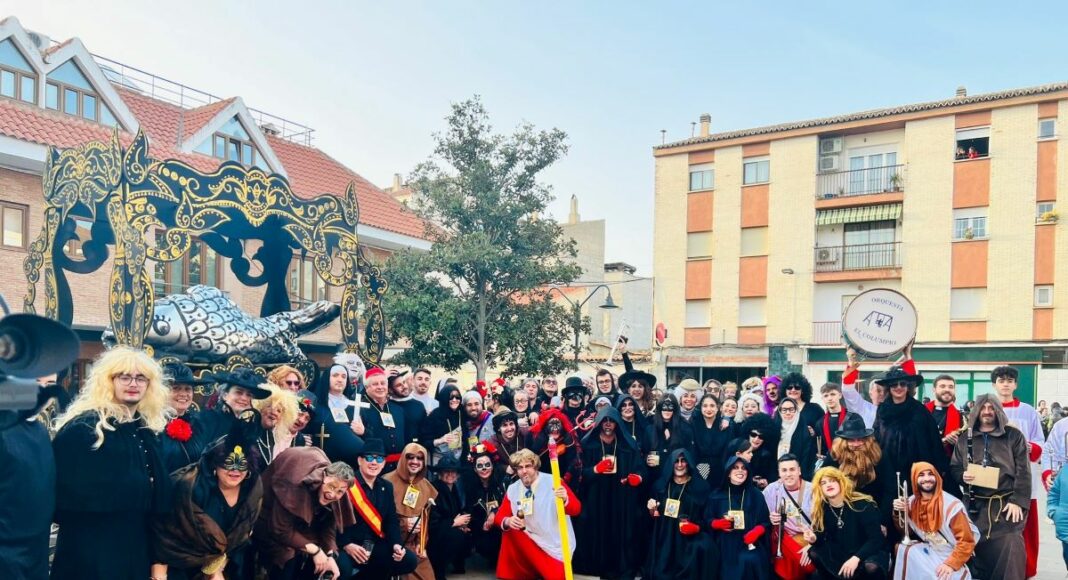 El alcalde de Bolaños, Miguel Ángel Valverde, junto a la concejala de Festejos, Rocio Plata, y otros miembros de la Corporación Municipal también participaron en el desfile carnavalesco que parodiaba un cortejo fúnebre.