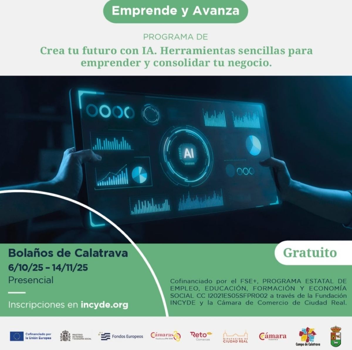 El Ayuntamiento de Bolaños de Calatrava, en colaboración con la Fundación INCYDE y la Cámara de Comercio de Ciudad Real, pone en marcha el programa formativo gratuito “Emprende y Avanza: Crea tu negocio con IA. Herramientas sencillas para emprender y consolidar tu negocio”, una iniciativa innovadora diseñada para apoyar a personas emprendedoras y empresarios/as locales en la integración de la Inteligencia Artificial en sus proyectos empresariales.