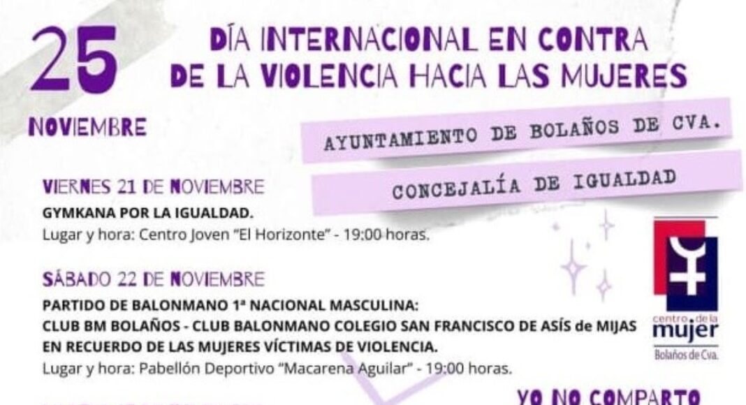 El 22 de noviembre, el deporte también se suma a esta causa con la disputa del partido de balonmano en categoría 1ª nacional masculina, entre el Club BM Bolaños y el Club Balonmano Colegio San Francisco de Asís de Mijas. Este evento, que se celebrará a las 19:00 horas en el pabellón Macarena Aguilar, tiene como objetivo rendir homenaje a las mujeres víctimas de violencia.