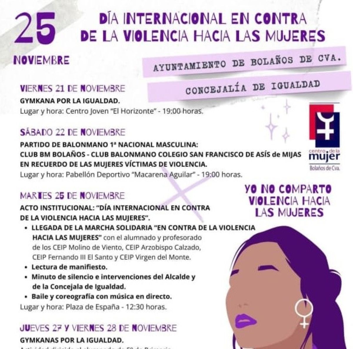 El 25 de noviembre, Día Internacional contra la Violencia hacia la Mujer, tendrá lugar una marcha solidaria que recorrerá las principales calles de la localidad. En ella participarán los alumnos y profesores de los colegios de la localidad: CEIP Molino de Viento, CEIP Arzobispo Calzado, CEIP Fernando III El Santo y CEIP Virgen del Monte. A las 12:30 horas, en la Plaza de España, se procederá a la lectura de un manifiesto y a un minuto de silencio en homenaje a las víctimas. Además, los miembros del grupo de gobierno también intervendrán en el acto, reafirmando el compromiso de Bolaños de Calatrava en la lucha contra esta lacra.