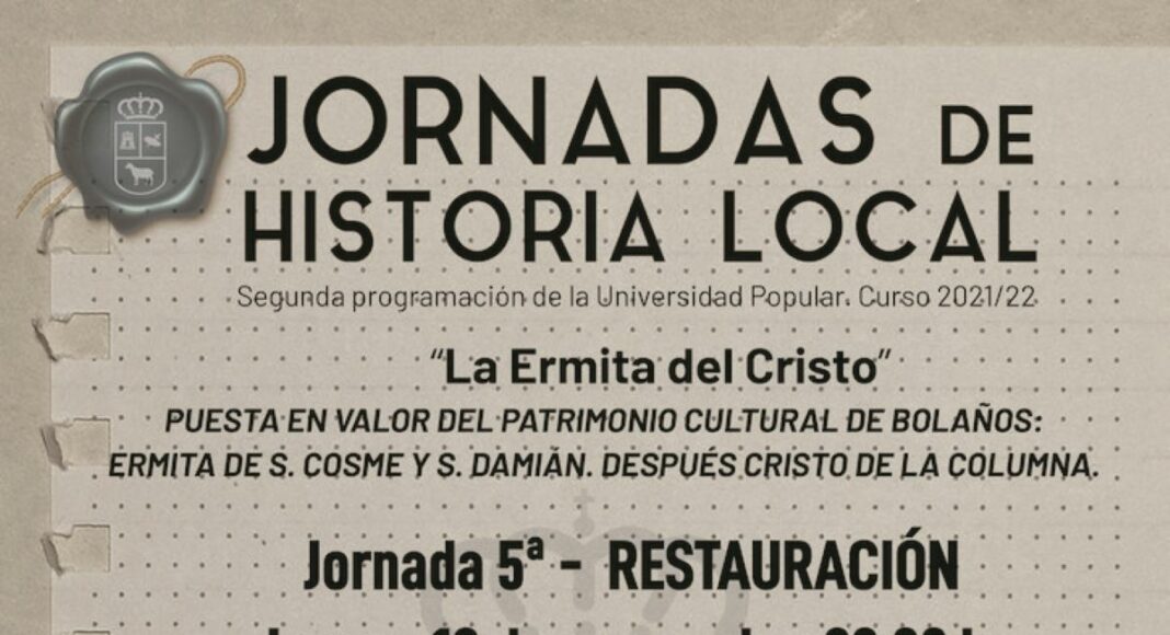El Ayuntamiento de Bolaños junto al Archivo Municipal y la Universidad Popular lleva organizando durante todo este mes unas Jornadas de Historia Local impartidas por profesionales que profundizan en la historia y descubrimientos de la Ermita de San Cosme y San Damián, después Cristo de la Columna. Dividida en seis conferencias, la penúltima jornada abordará “Las pinceladas ocultas de la Ermita del Cristo. Hallazgo y restauración de las pinturas medievales”, a cargo de Dª Giuliana Medda, conservadora y restauradora de bienes culturales, este jueves, a las 20:00 horas, en el citado lugar.
