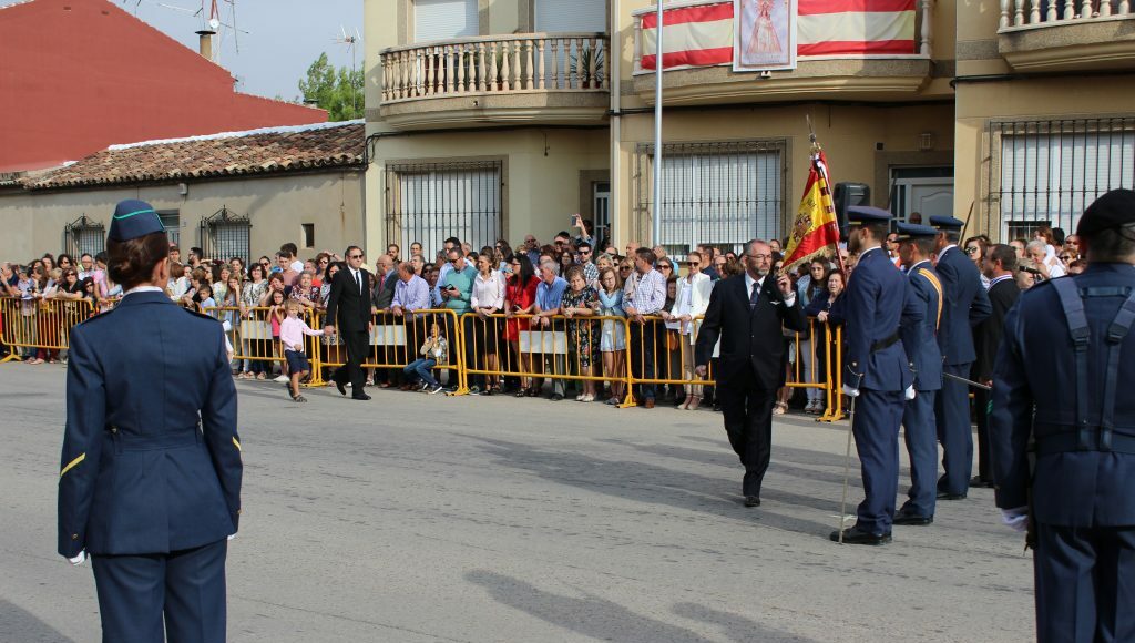 Casi 300 personas participaron esta mañana en la Jura de Bandera civil organizada por el Ayuntamiento de Socuéllamos y la Base Aérea de Albacete Los Llanos con motivo de las fiestas en honor a Nuestra Señora de Loreto, común patrona del municipio y del Ejército del Aire.