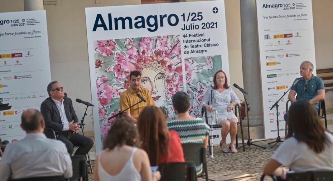 El director del Festival de Teatro Clásico de Almagro, Ignacio García; el director de promoción cultural de la ONCE, Ángel Luis Gómez y los actores de la compañía La Luciérnaga Esther Higueras y Jordi Sabaté han ofrecido este lunes una rueda de prensa en el Palacio de Valdeparaiso para presentar la obra ‘Diablos, brujas y granujas’.