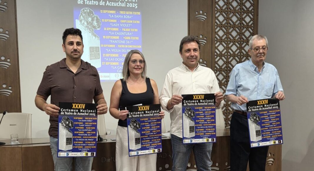 El director del Área de Cultura, Deportes y Juventud de la Diputación de Badajoz, Manuel Candalija; la teniente de alcalde y concejala de Cultura de Aceuchal, María del Carmen Merchán; el presidente de Acebuche Teatro, Barto García; y el coordinador del certamen, Antonio Rodríguez, han presentado esta nueva edición, cuyas obras se pondrán en escena en la Casa de la Cultura y optan a premios y trofeos que tienen el ajo de la localidad como protagonista.