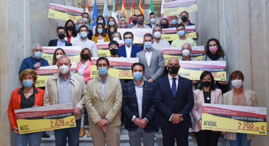 El presidente de la Diputación de Ciudad Real, José Manuel Caballero, acompañado del Vicepresidente responsable del Área de Cultura, David Triguero, ha hecho entrega esta mañana de un cheque solidario a las diferentes asociaciones sin ánimo de lucro de la provincia que se han sumado este año al programa de “Conciertos en espacios y lugares emblemáticos”. Una iniciativa impulsada por la institución provincial, que en esta V edición incluía como novedad un donativo solidario en la reserva de localidades de los 12 conciertos programados.