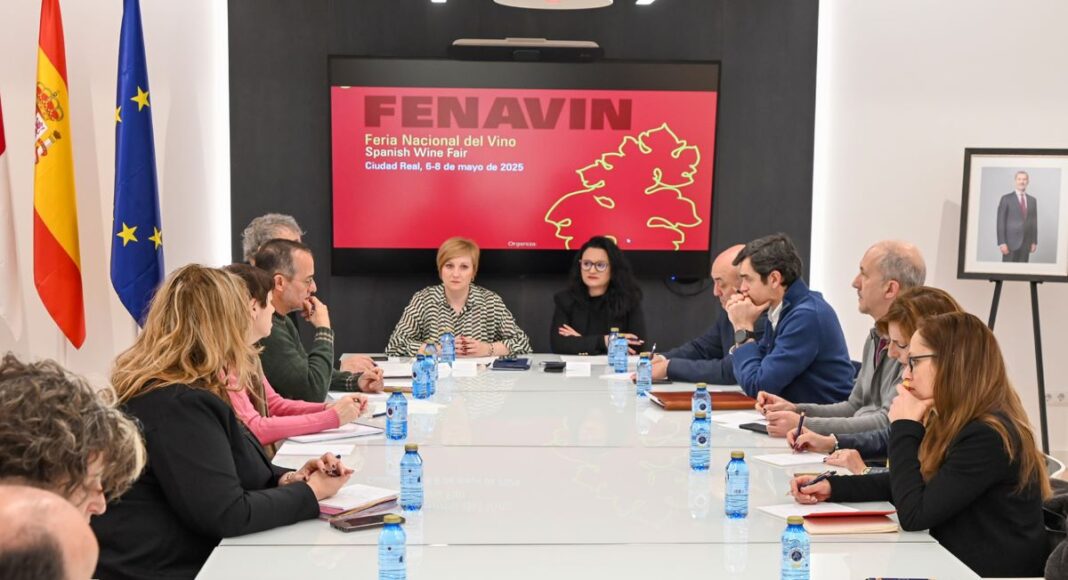 La vicepresidenta del Área de Impulso Económico y Territorial a la Provincia y Reto Demográfico de la Diputación de Ciudad Real y coordinadora institucional de la Feria Nacional del Vino, Sonia González, junto a la portavoz del equipo de gobierno, Rocío Zarco, y el director de FENAVIN, Manuel Juliá, han mantenido una reunión con representantes de las Denominaciones de Origen (DD.OO.), Indicaciones Geográficas Protegidas (IGP) de la provincia y Grupos de Desarrollo Rural para pedir la colaboración y su implicación en una actividad paralela a FENAVIN que consistirá en la habilitación de un amplio espacio anexo que servirá para la promoción de la provincia de Ciudad Real.