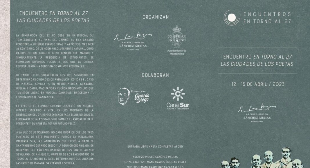 El Ayuntamiento de Manzanares organiza unas nuevas unas jornadas anuales dedicadas a la Generación del 27. Bajo el nombre ‘Las ciudades de los poetas’, el primero de estos encuentros ‘En torno al 27’ tendrá lugar entre el 12 y el 15 de abril en el archivo-museo ‘Sánchez Mejías’. Incluirá tres conferencias, la proyección de un documental y una visita guiada.