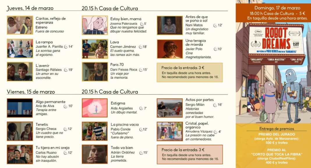 El XI festival de cine social ‘ManzanaREC’ llegará a su fin el domingo 17 (18 horas) con la proyección de ‘Robot dreams’, película que recibió cuatro nominaciones y obtuvo dos galardones en los recientes Premios Goya (mejor película de animación y mejor guión adaptado). También se celebrará la gala de clausura, en la que se entregarán los dos premios que hay en juego, el del jurado, otorgado por el Ayuntamiento de Manzanares y dotado con 500 euros y trofeo; y el premio “al corto que toca la fibra”, otorgado por CiudadRealFibra y dotado con 400 euros y trofeo.