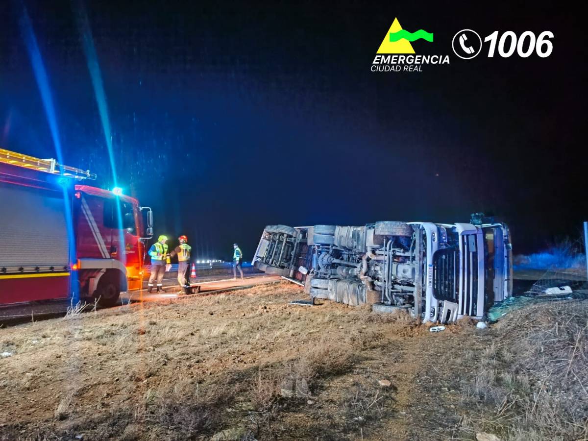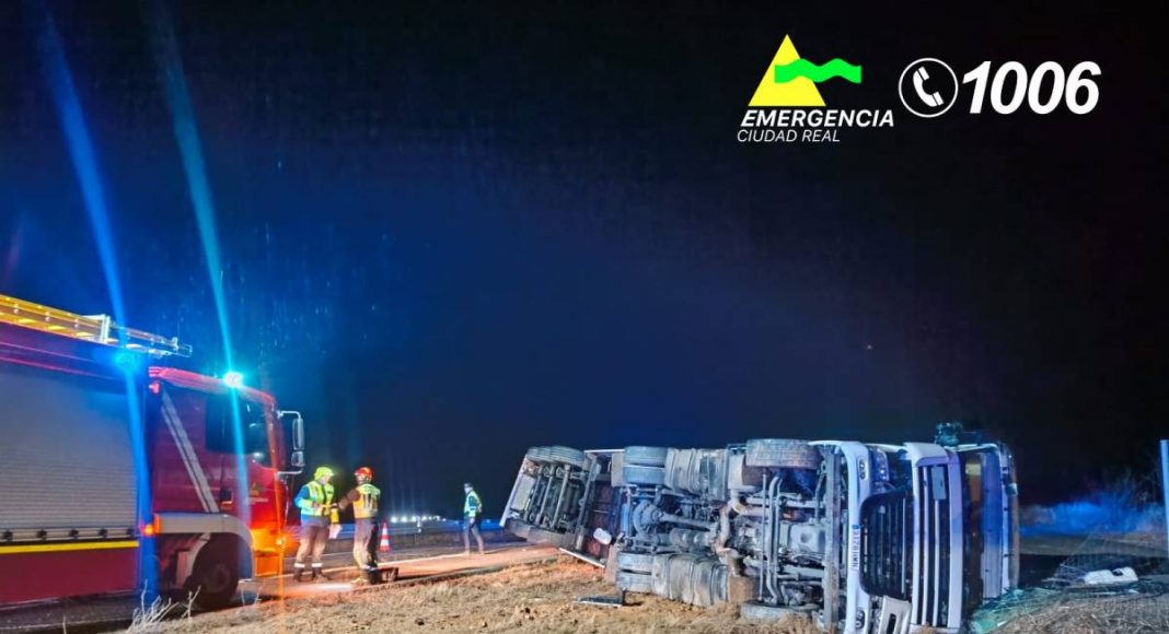 Esta madrugada, a las 00:09 horas, los bomberos del parque de Manzanares han intervenido en un accidente de tráfico registrado en el kilómetro 180 de la autovía A-4, en sentido Madrid. Un camión articulado ha volcado, provocando un derrame de combustible en la calzada.