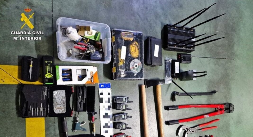 En el registro se intervinieron dos vehículos de alta gama, joyas y dinero en efectivo, además de diversas herramientas para llevar a cabo los robos, algunas de ellas específicas de cerrajería, documentación falsa, sistemas de comunicación inalámbrica e inhibidores de frecuencia.